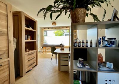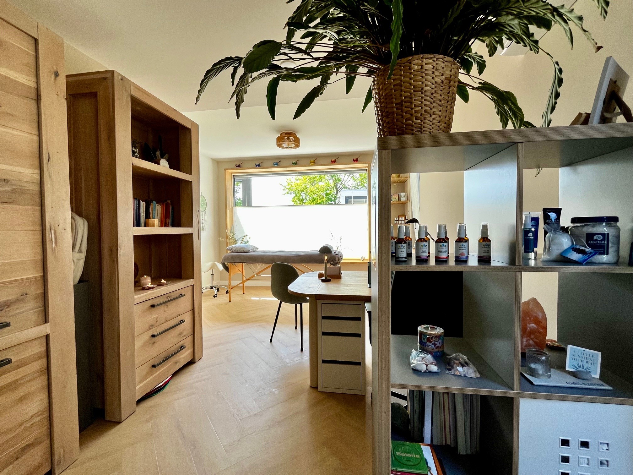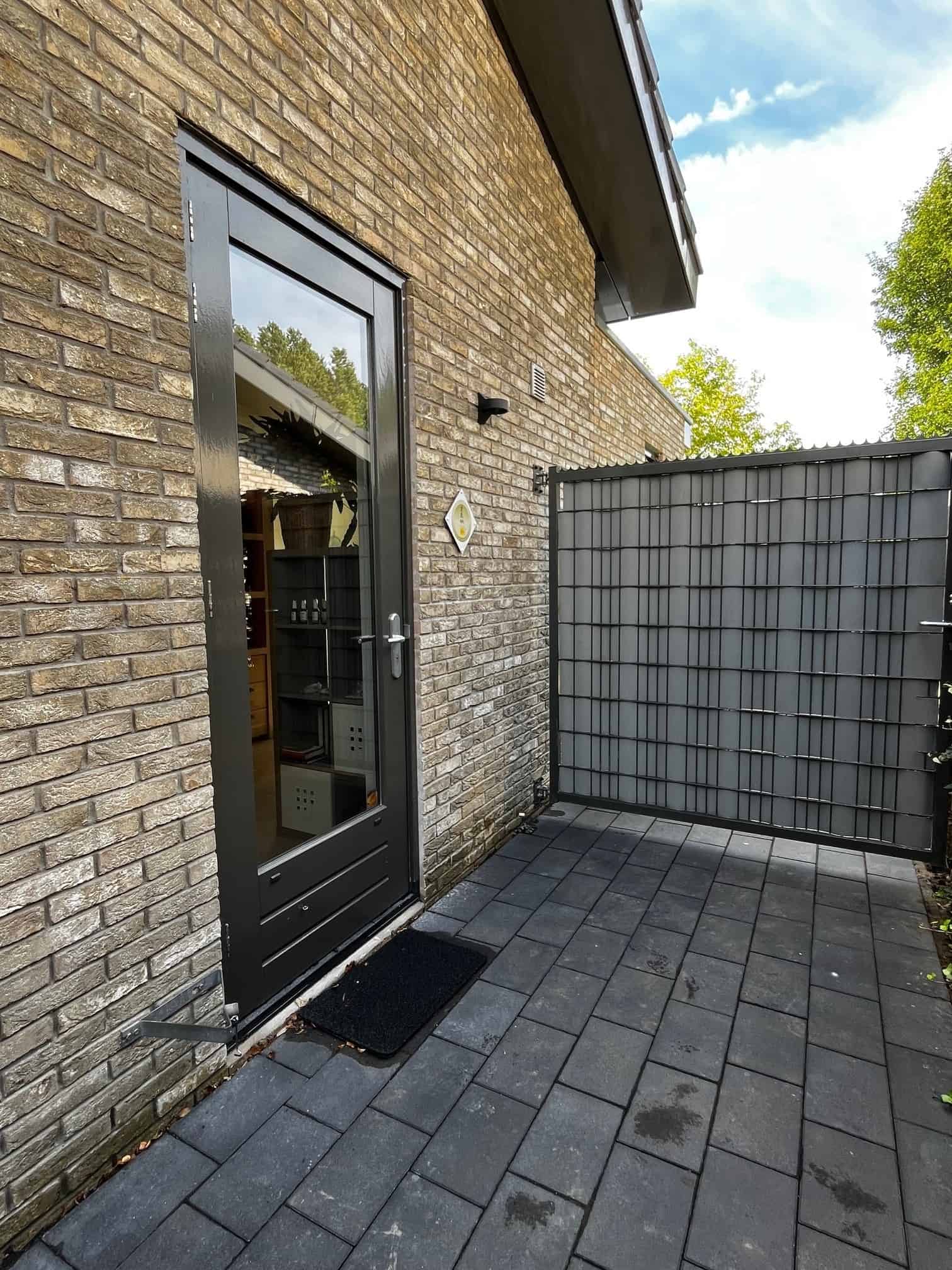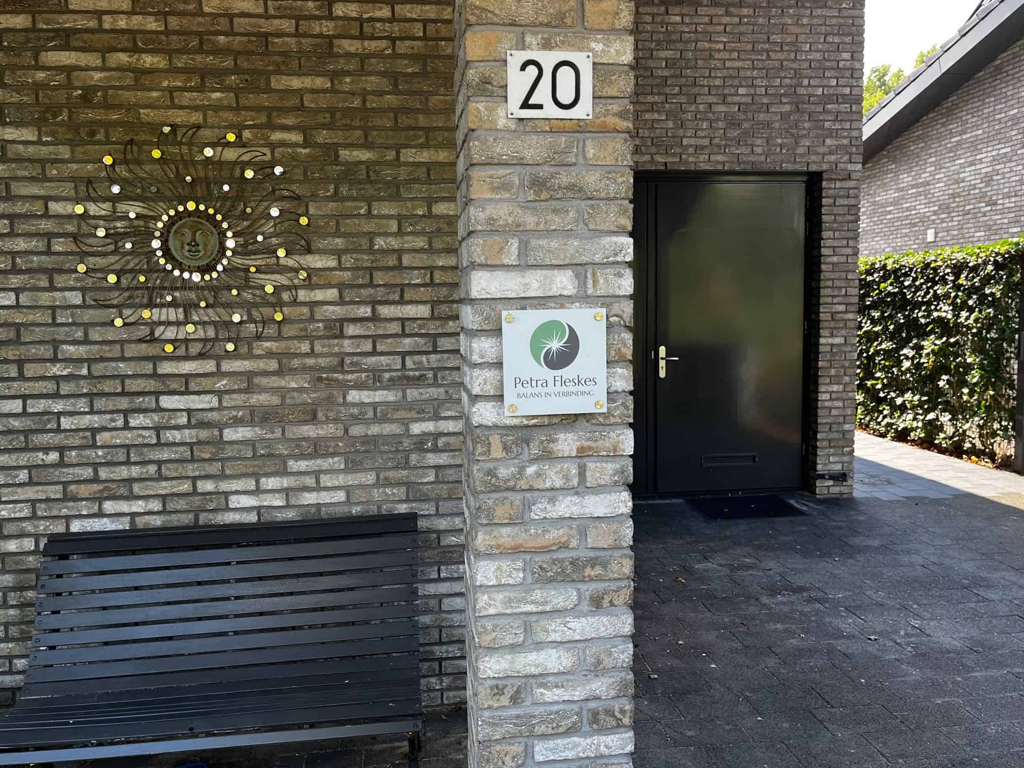 De ingang van de praktijk is naast het huis, vóór de poort links.